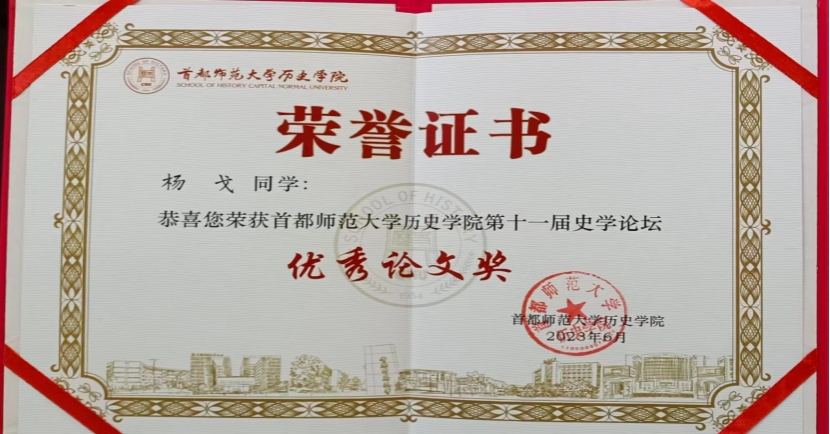 1、2023年6月由21级硕士研究生杨戈撰写的论文《汉魏六朝史评中的汉桓帝形象》获首都师范大学乐天使第十一届史学论坛优秀论文奖