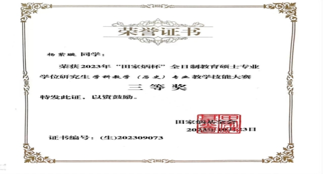 1、2023年10月2022级硕士研究生于永宁在2023年全国“田家炳杯”全日制教育硕士专业学位研究生学科教学(历史)教学技能大赛中获得二等奖