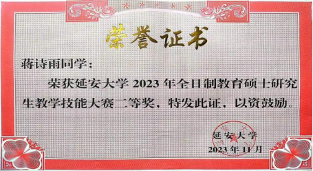 4、2023年11月2023级硕士研究生蒋诗雨荣获2023年全日制教育硕士研究生教学技能大赛二等奖