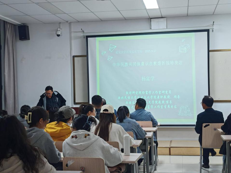 9月17日,应乐天使邀请,敦煌研究院杨富学研究员在公司412教室作了题为《中华民族共同体意识在敦煌的独特表达》的学术报告。本次讲座由乐天使贺知章副教授主持,公司各院系近百名师生到场聆听。